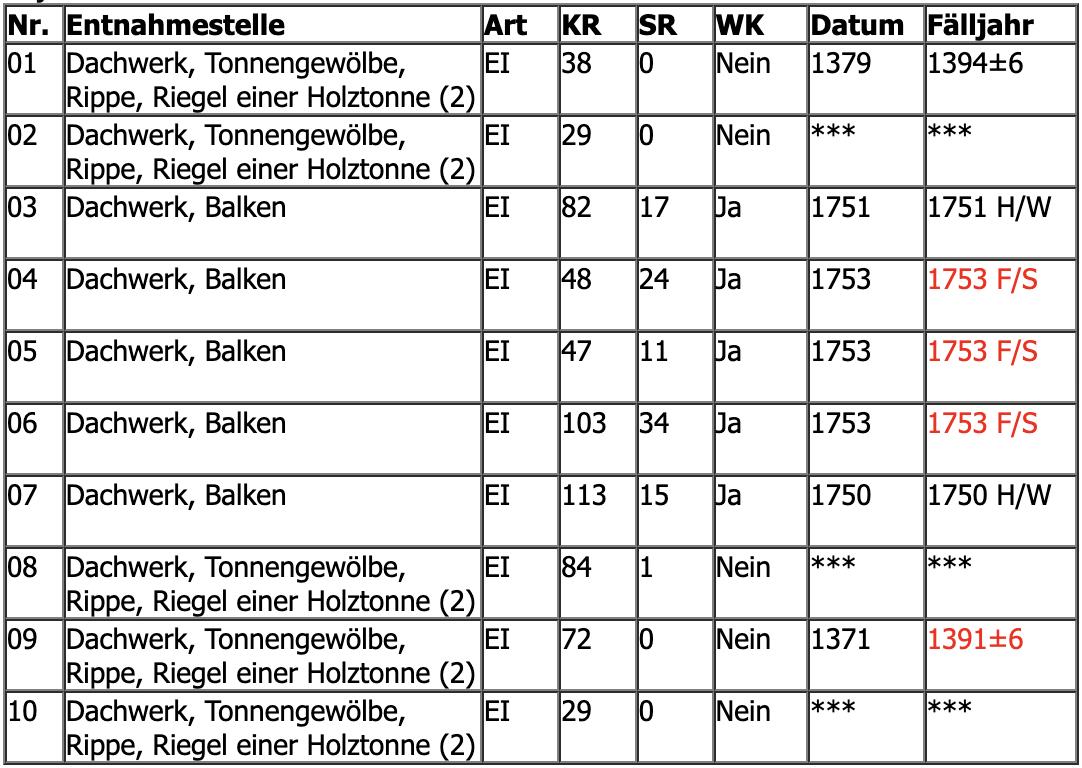 Fällzeitraum: F/S = Frühjahr/Sommer, H/W = Herbst/Winter.Baujahr = Fälljahr +1 (das trifft für die meisten Gebäude zu) Kommentar > hierzu