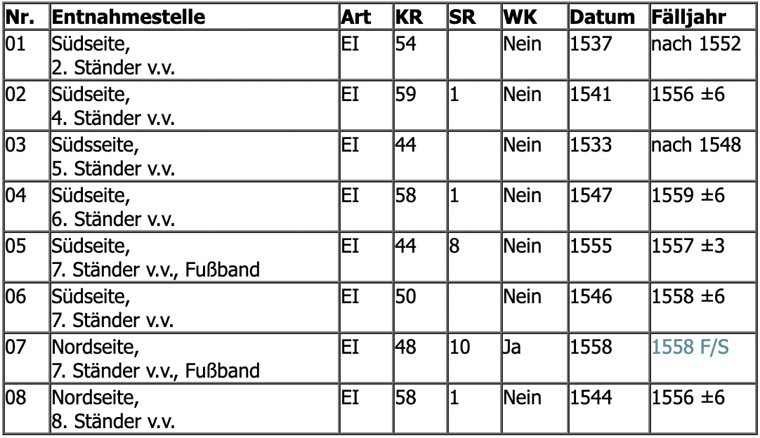 Fällzeitraum: F/S = Frühjahr/Sommer, H/W = Herbst/Winter.Baujahr = Fälljahr +1 (das trifft für die meisten Gebäude zu) Kommentar > hierzu