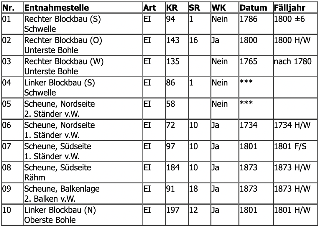 Fällzeitraum: F/S = Frühjahr/Sommer, H/W = Herbst/Winter.Baujahr = Fälljahr +1 (das trifft für die meisten Gebäude zu) Kommentar > hierzu