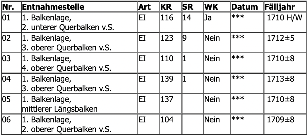 Fällzeitraum: F/S = Frühjahr/Sommer, H/W = Herbst/Winter.Baujahr = Fälljahr +1 (das trifft für die meisten Gebäude zu) Kommentar > hierzu